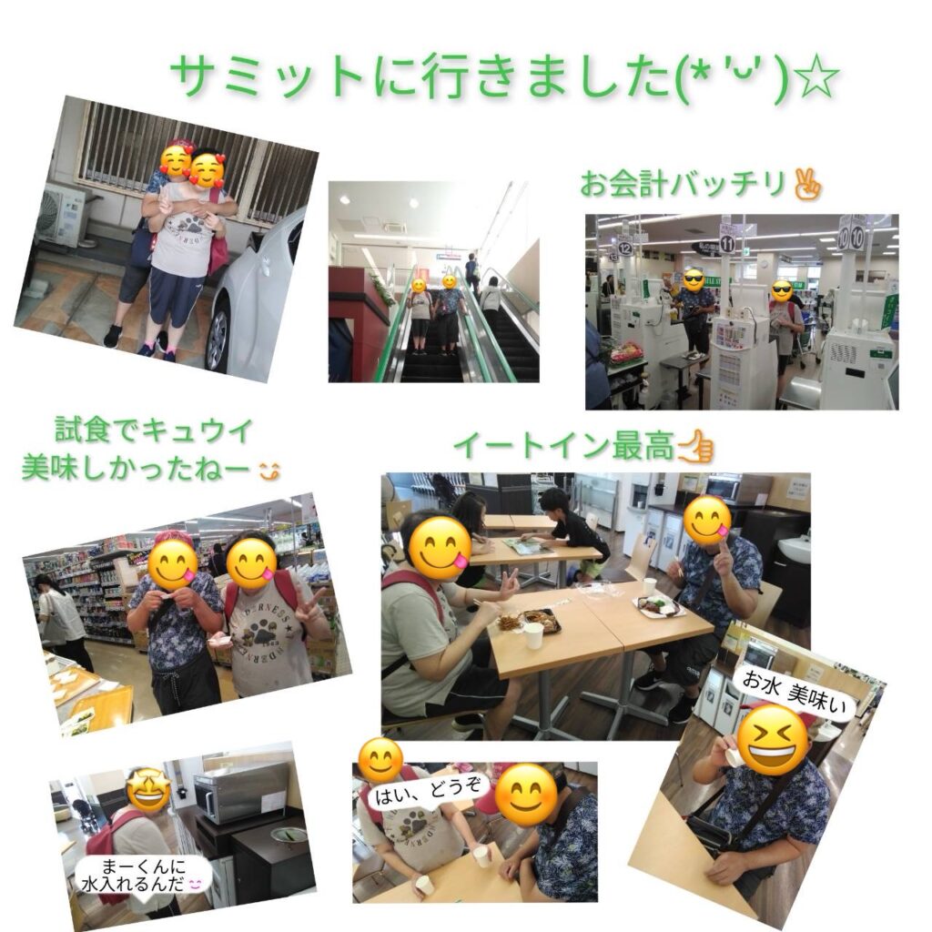 お昼は「サミット」のイートインスペースへ。仲良く並んでごはんを食べる姿は、とても微笑ましい光景でした。エスカレーターの利用も、セルフレジでのお会計もバッチリです!