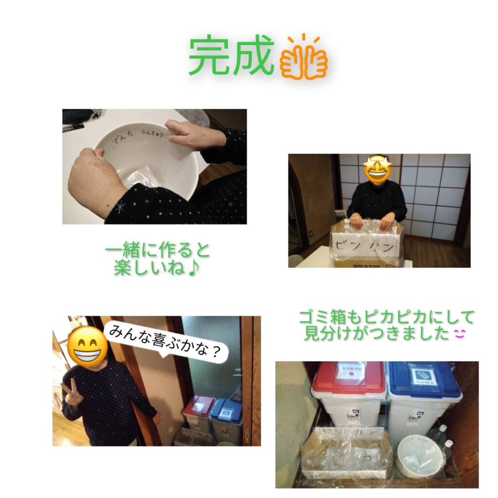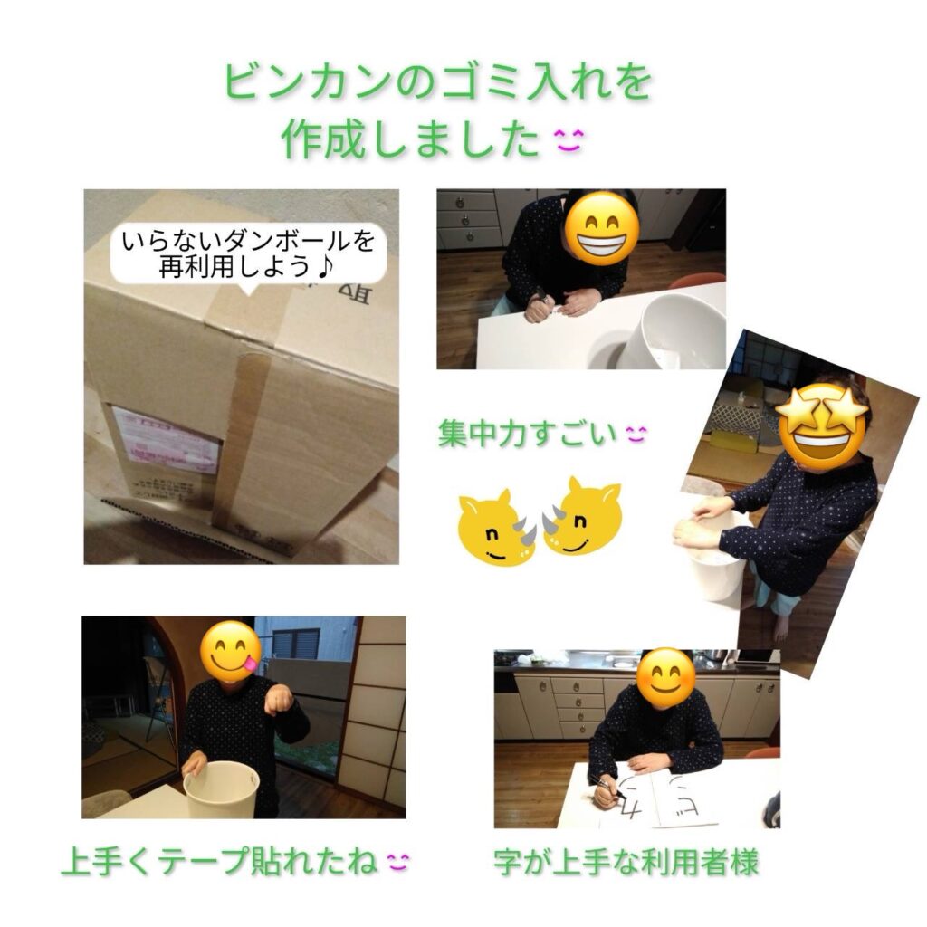 「にこにこの家」では、今回のゴミ箱づくりのように、アットホームな雰囲気の中で、入居者さん一人ひとりに合わせた生活支援を行っています。