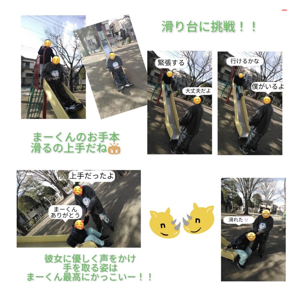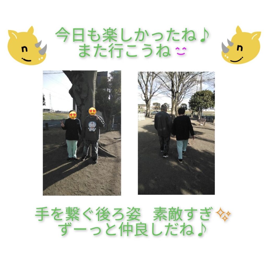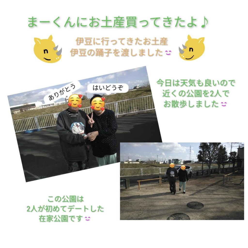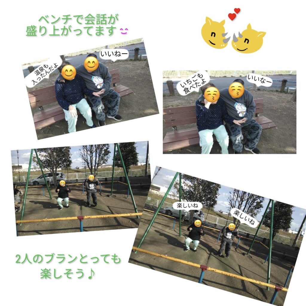 近所の公園へお出かけし、伊豆旅行のおみやげを渡すことができ、とても嬉しそうな笑顔が見られました。二人で過ごす時間は終始楽しそうで、会話も大盛り上がり!