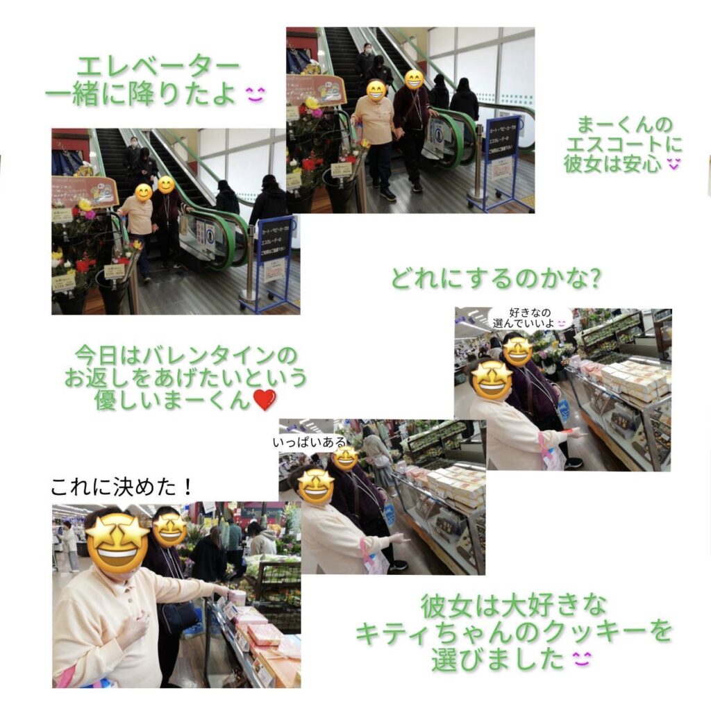 お手紙交換の後は、近所のスーパーへお買い物。バレンタインのお返しとして、彼女のくみさんが大好きなキティちゃんのクッキーを一緒に選びました!