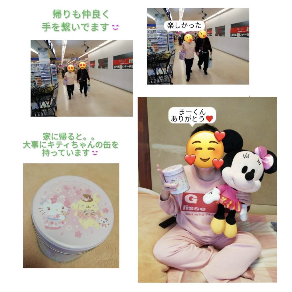 帰り道ももちろん仲良く手をつなぎます。そして、彼女のくみさんはキティちゃんのクッキーの缶が宝物になったようです!
